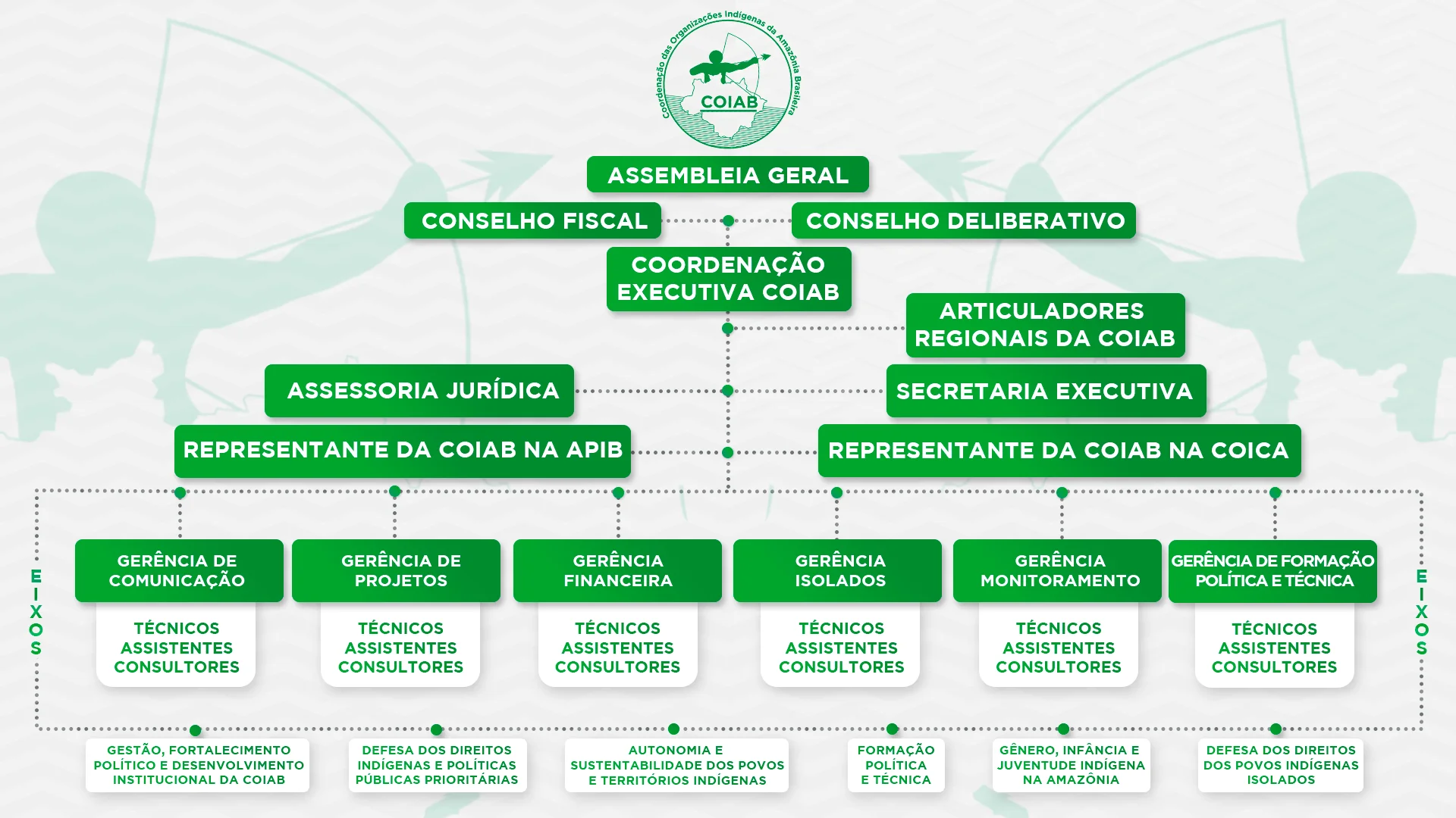 Conselheiros Articuladores: Fazem parte das organizações indígenas regionais de acordo com a organização territorial ou povo. Os segmentos também fazem parte.