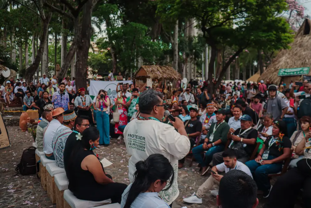 Coordenador-geral da Coiab, Toya Manchineri em discurso no lançamento da coalizão do G9. Cali – Colômbia(Foto: Kaiti Tomprare/2024)