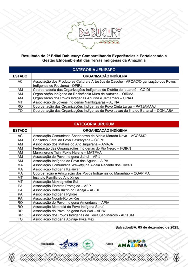 A CESE e a Coiab agradecem a participação de todas as organizações indígenas que enviaram suas propostas e reforçam que o Dabucury segue comprometido com a defesa dos territórios e com o fortalecimento das iniciativas de gestão ambiental conduzidas pelos próprios povos indígenas.
