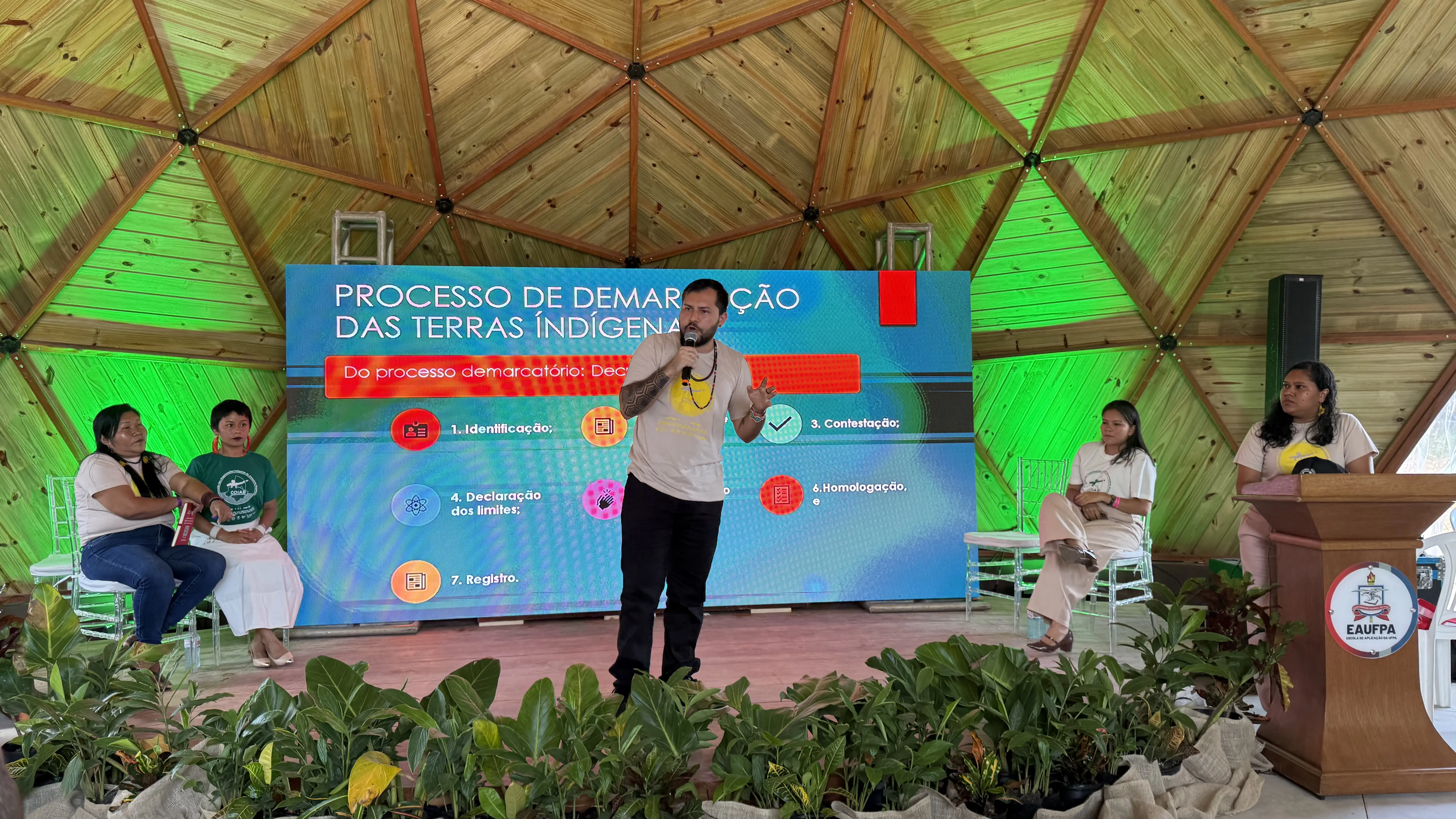 Durante a apresentação, Leonardo Borari, advogado indígena da Coiab, explicou em detalhes o funcionamento do processo demarcatório. Para ele, além de todo o rito burocrático, persistem ameaças legislativas que comprometem o direito dos povos indígenas ao território.