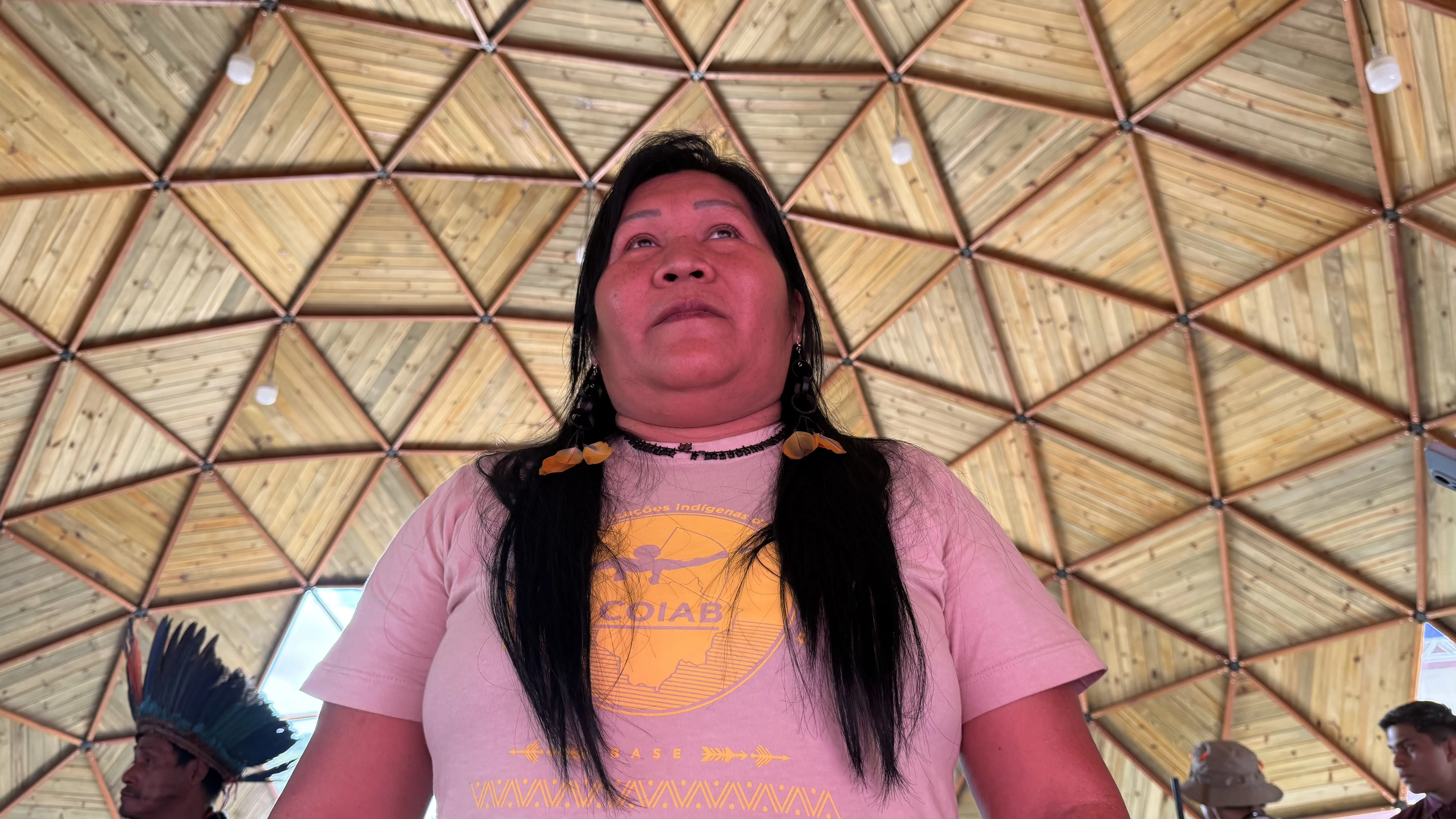 Dineva Kayabi, coordenadora-tesoureira da COIAB, integrou a mesa e encerrou o encontro entoando um canto que emocionou o público.