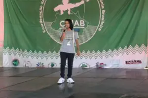 A cursista Mydiwaru Karajá, do Tocantins, destacou a importância do ritual de alimentação sólida para as crianças de seu povo. Ela explicou que o ritual, que envolve toda a comunidade, é um momento de grande significado cultural, conectando os bebês às raízes do povo Karajá e transmitindo força, sabedoria e espiritualidade.