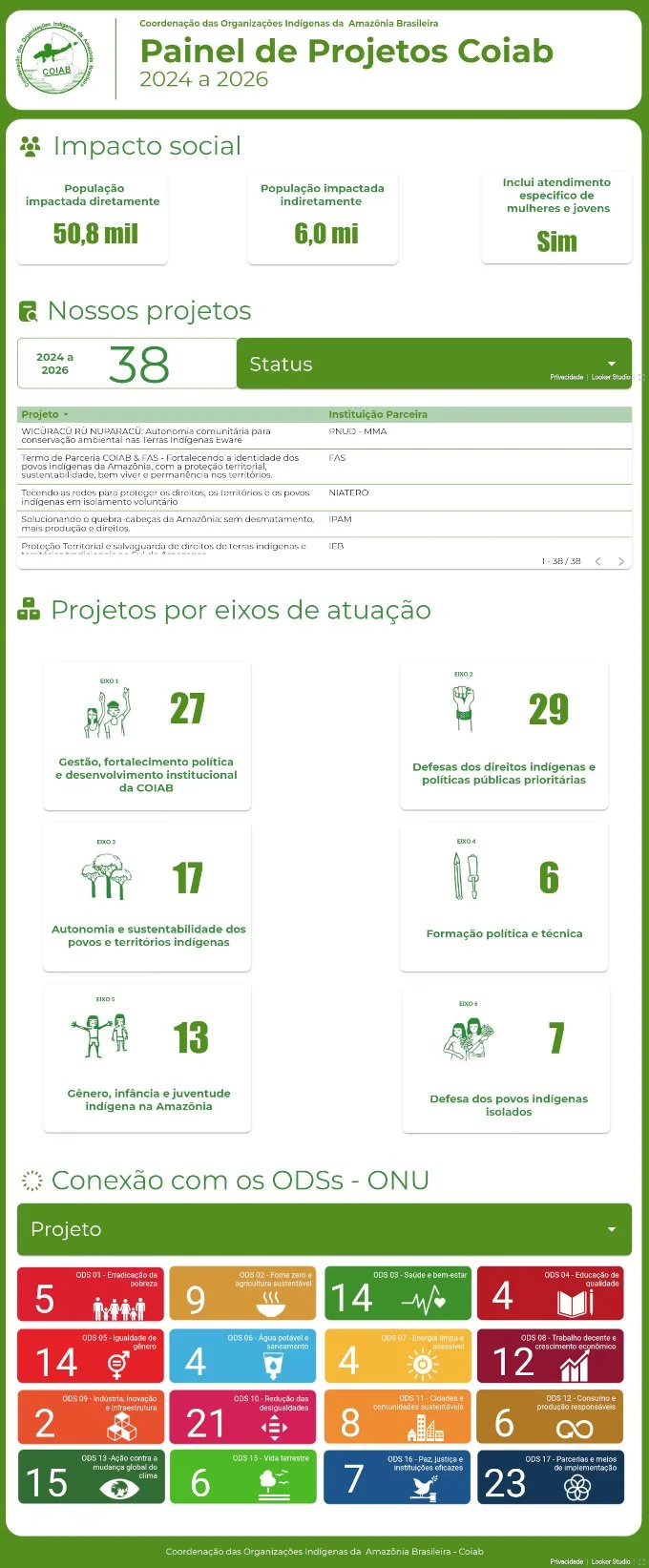 Este painel é um farol de conhecimento, revelando dados cruciais sobre os projetos conduzidos pela Coiab em suas comunidades indígenas.