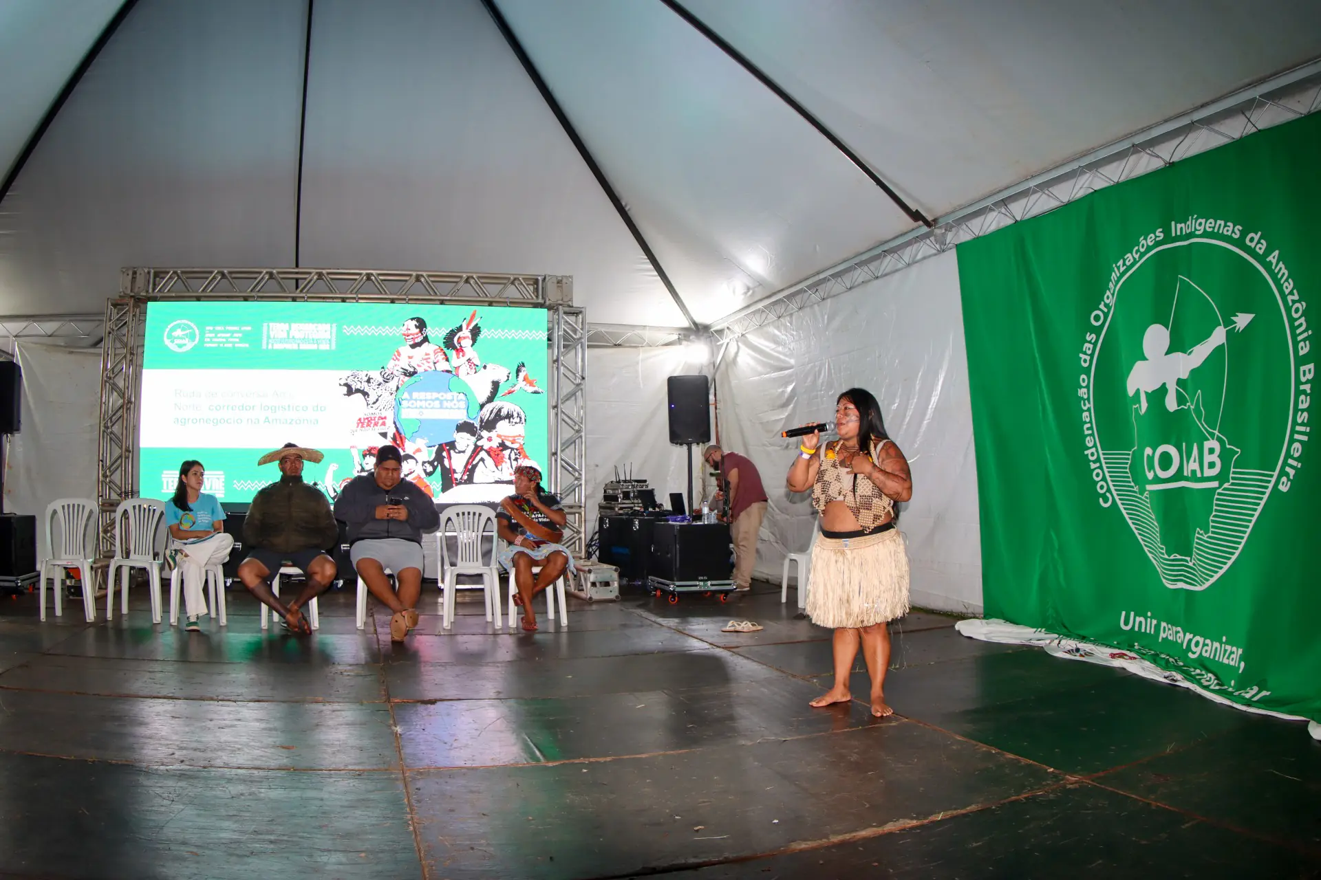 Lideranças indígenas da Amazônia e especialistas discutiram os riscos de viabilidade da Ferrogrão e os impactos socioeconômicos nos territórios durante a Roda de Conversa Arco Norte: Corredor Logístico do Agronegócio na Amazônia, realizada na tenda da Coordenação das Organizações Indígenas da Amazônia Brasileira (Coiab) no Acampamento Terra Livre (ATL), na noite desta terça-feira (7).