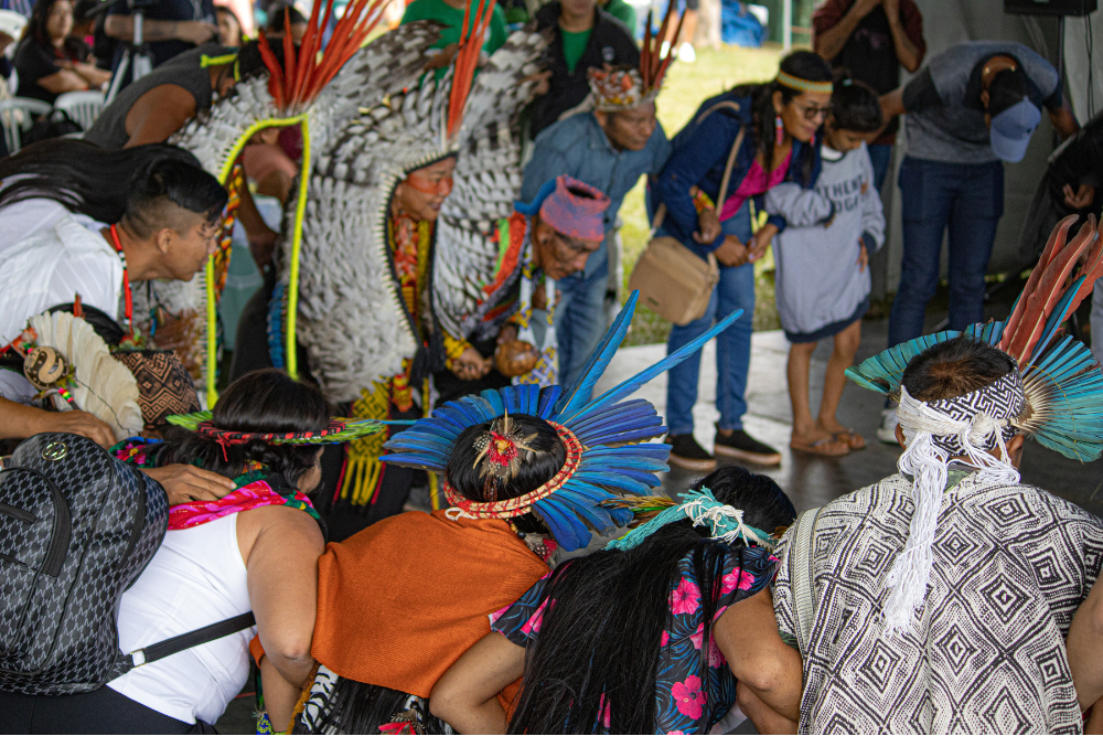 Enquanto os governos seguem a lógica egoísta de “cada um por si”, nós, em uma união de povos, tecemos uma rede de resistência e esperança entre as terras da Amazônia e os mares do Pacífico. Nossos saberes ancestrais e nossos corações batem juntos, protegendo a terra, o ar e as águas, garantindo que o canto das florestas e oceanos nunca se apague.