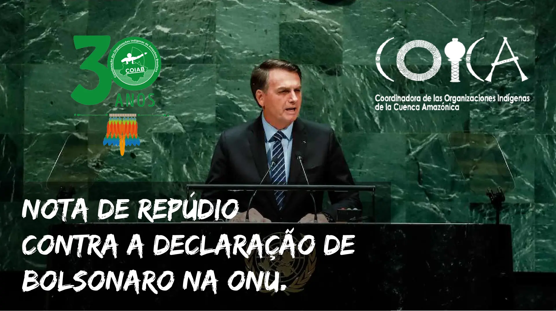 “A Coordenação das Organizações Indigenas da Amazônia Brasileira –COIAB com apoio de suas bases territoriais nos estados amazônicos do Acre, Amazonas, Amapá, Maranhão, Mato Grosso, Pará, Rondônia, Roraima e Tocantins, representante de mais de 180 povos, mais de 430 mil populações indígenas, mais de 300 organizações indígenas e seus mais de 430 territórios, vem a público manifestar VEEMENTE REPÚDIO contra a declaração realizada pelo presidente do Brasil, senhor Jair Messias Bolsonaro no Plenário da Assembleia-Geral das Nações Unidas neste dia 24 de setembro 2019.”