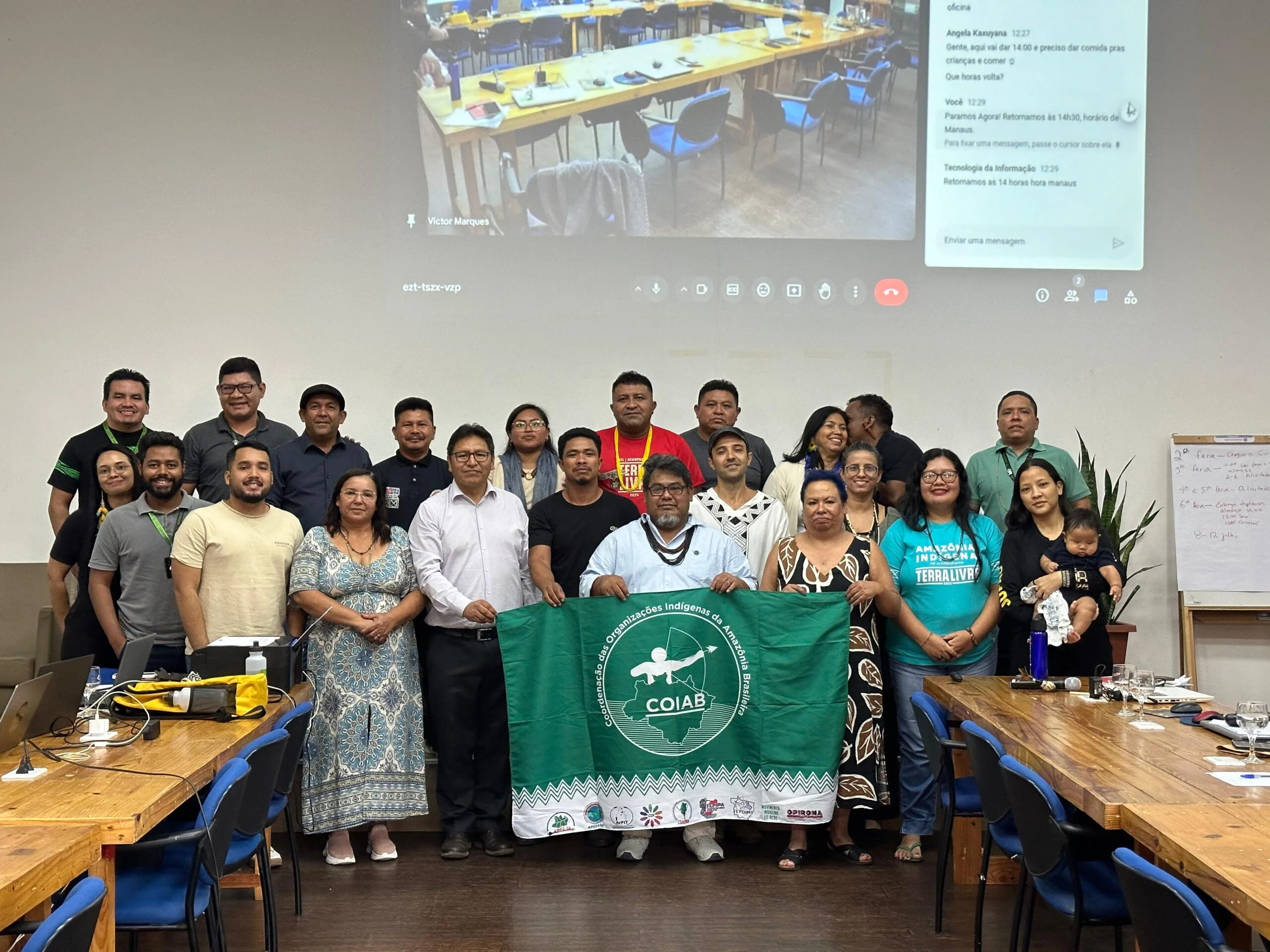 O encontro teve a presença da coordenação executiva e gerências da Coiab; representantes da OTCA e da Coordenadoria das Organizações Indígenas da Bacia Amazônica (Coica); Sineia do Vale, coordenadora do Comitê Indígena de Mudanças Climáticas (CIMC); Marcos Karajá, da Articulação dos Povos Indígenas do Tocantins (Arpit); Ronaldo Amaniê, da Federação dos Povos Indígenas do Estado do Pará (Fepipa); Mariana Aikanã, da Organização dos Povos Indígenas de Rondônia, Noroeste do Mato Grosso (Opiroma); Edinho Macuxi, do Conselho Indígena de Roraima (CIR); Jean Claude, da Articulação dos povos e organizações indígenas do Amapá e Norte do Pará (Apoianp); Marinete Almeida, da União das Mulheres Indígenas da Amazônia Brasileira (Umiab); Cristo Reis Guajajara, da Coordenação das Organizações e Articulações dos Povos Indígenas do Maranhão (Coapima); Wuriu Manchineri, do Manxinerune Tsihi Pukte Hajene (Matpha); e Mariazinha Baré, da Articulação das Organizações e Povos Indígenas do Amazonas (Apiam).