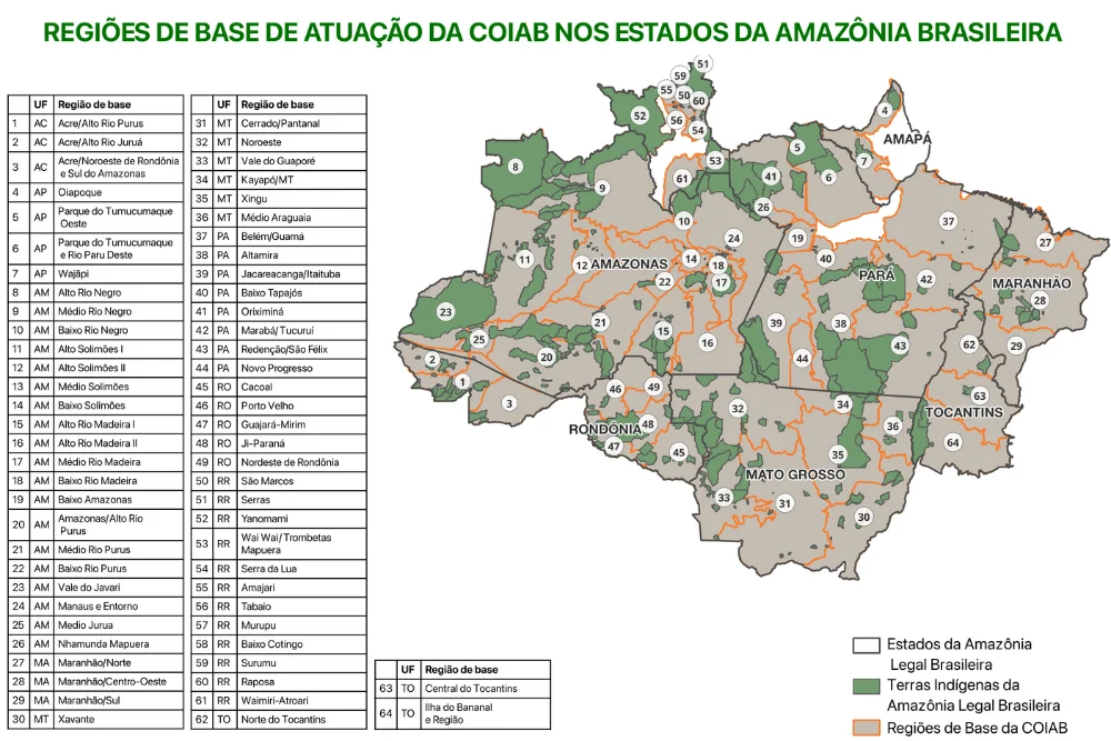 Mapa das 64 regiões de base da Coiab. Imagem: Amanda Avila (GEMTI)/2024